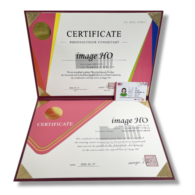 - 2급 : 퍼스널컬러 셀프테스터로 4계절 진단과 활용법 조언을 할 수 있고 이미지호 파트너 강사로 활동 가능